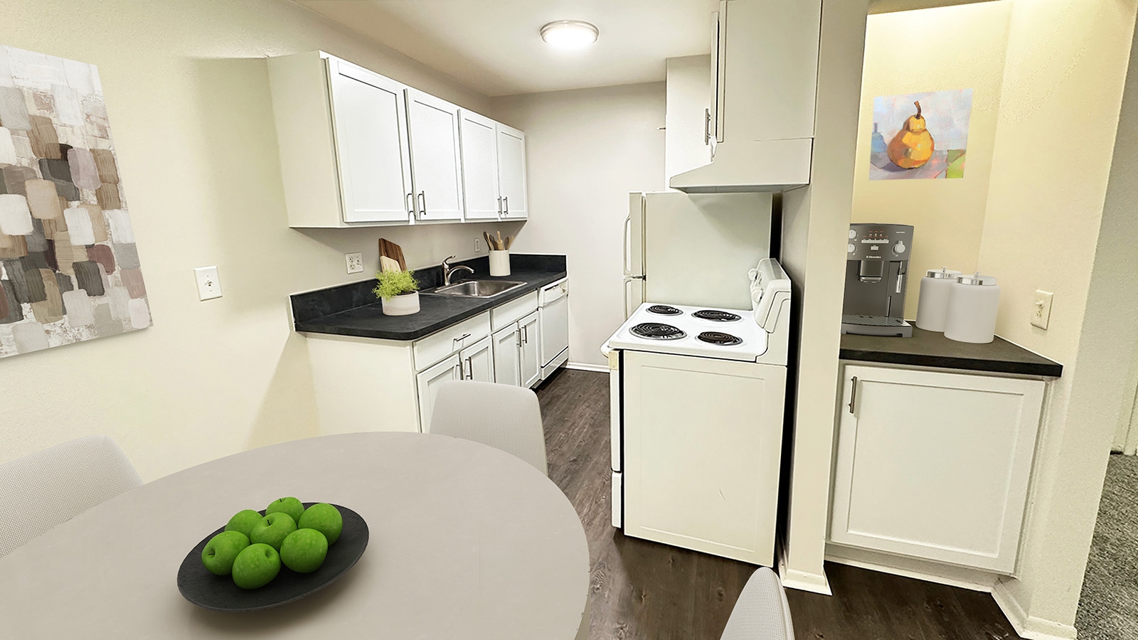 Wellington Place Apartments offers newly renovated one-bedroom layouts in a small, peaceful community. Each apartment includes updates like white shaker-style cabinetry, soapstone-look countertops, and brushed nickel fixtures. With a walk-in closet, linen closet, and pantry, storage is simple and built in.